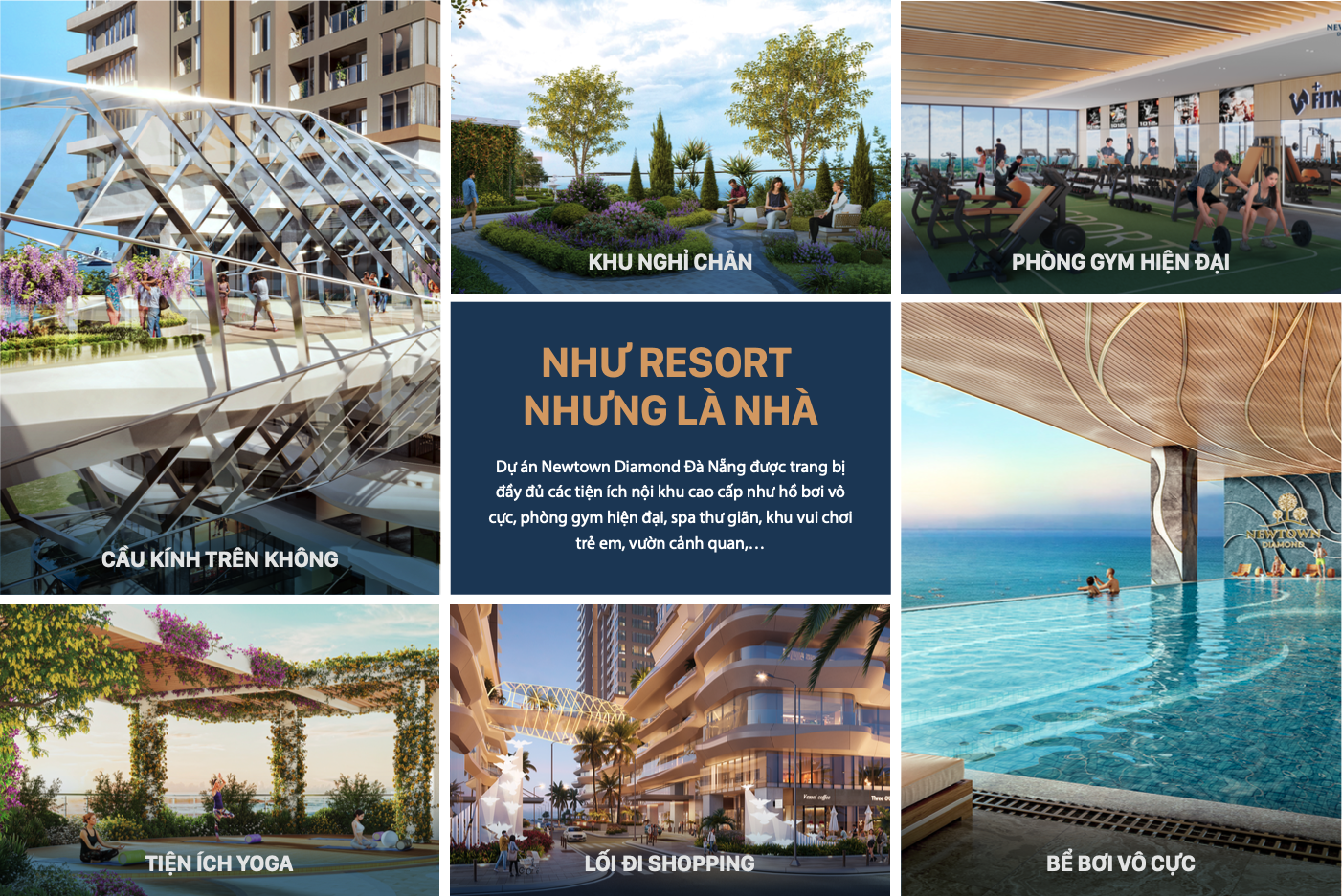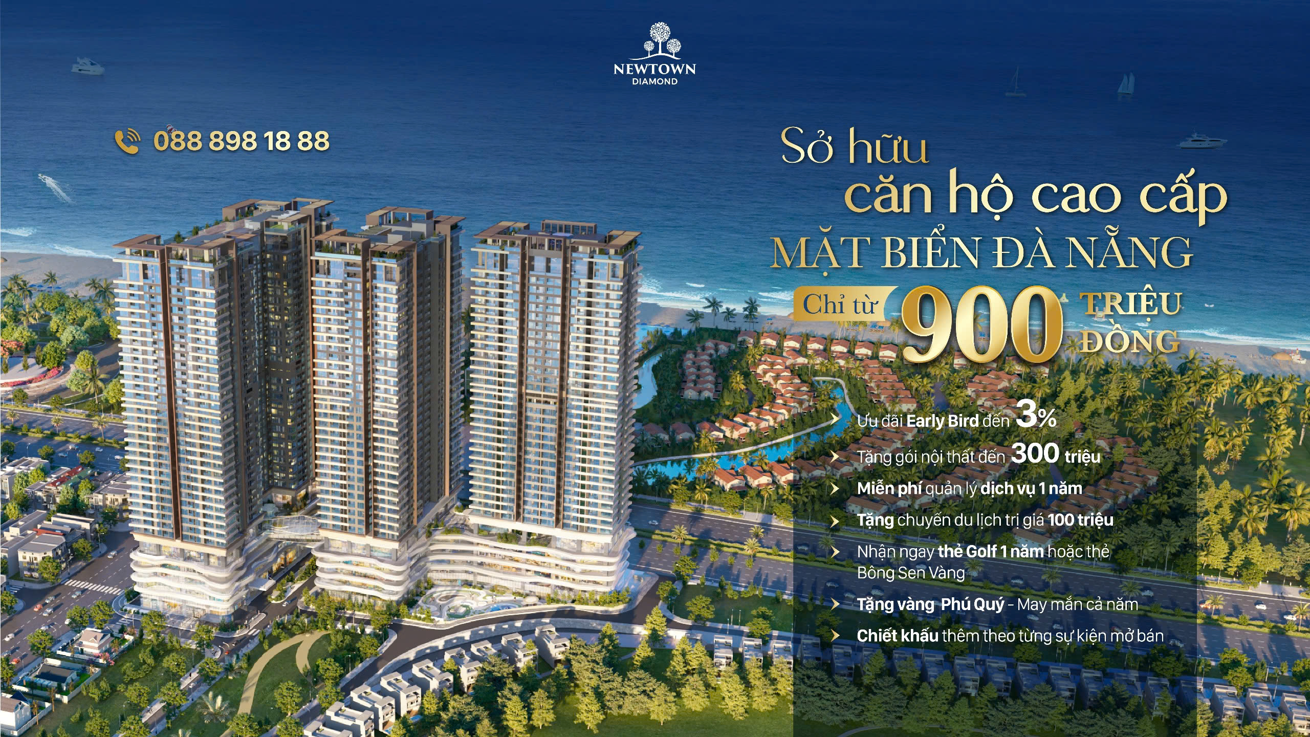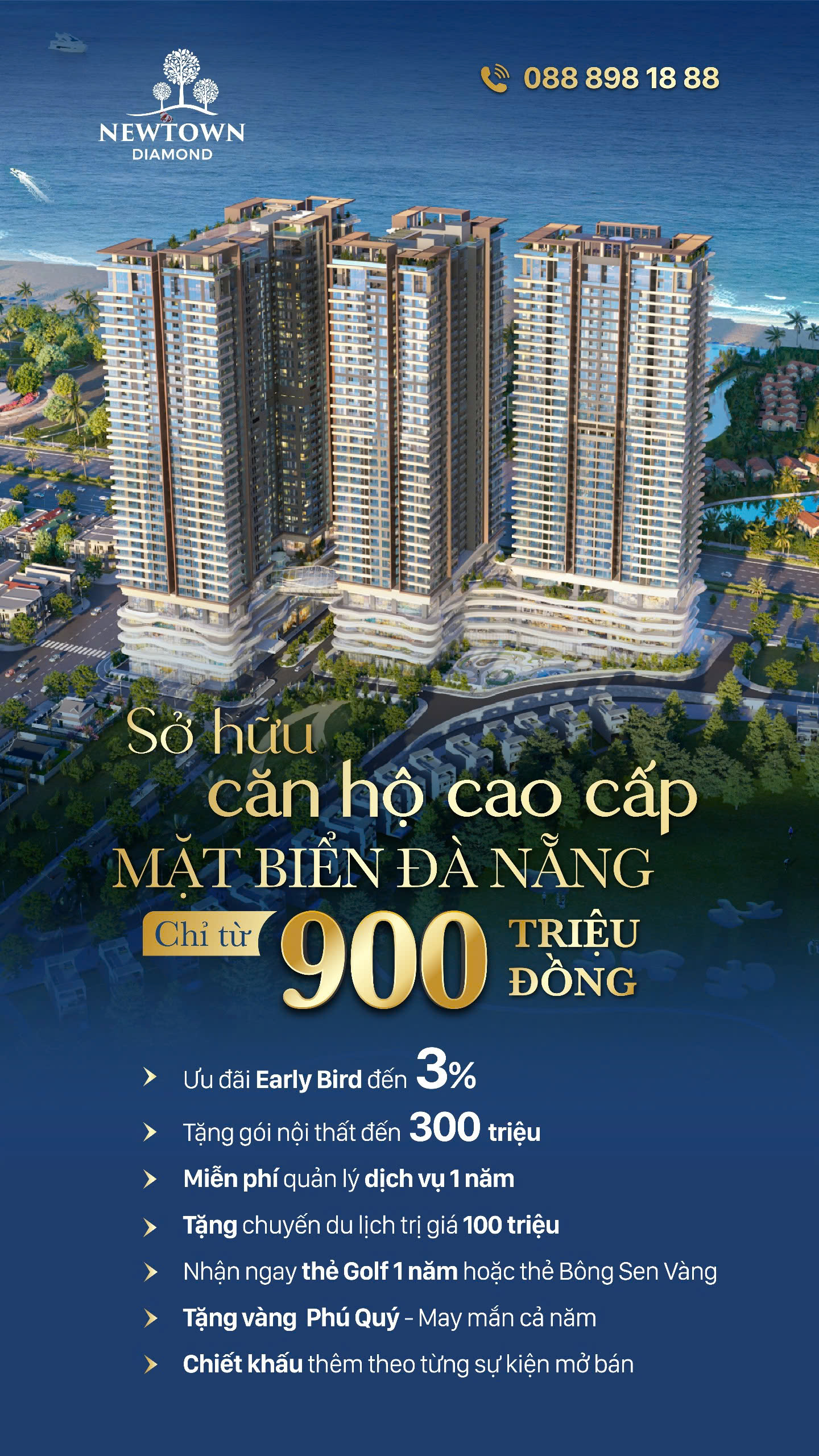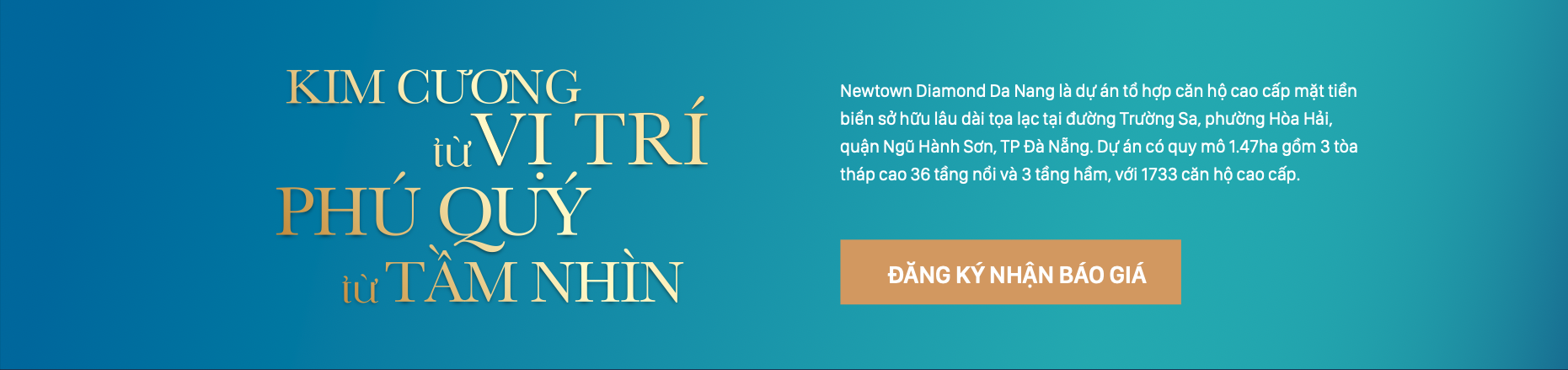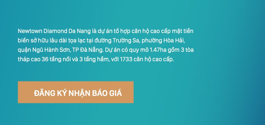 Newtown Diamond Da Nang là dự án tổ hợp căn hộ cao cấp mặt tiền biển sở hữu lâu dài tọa lạc tại đường Trường Sa , phường Hòa Hải, quận Ngũ Hành Sơn, TP Đà Nẵng. Dự án có quy mô 1.47ha gồm 3 tòa tháp cao 36 tầng nổi và 3 tầng hầm, với 1733 căn hộ cao cấp.