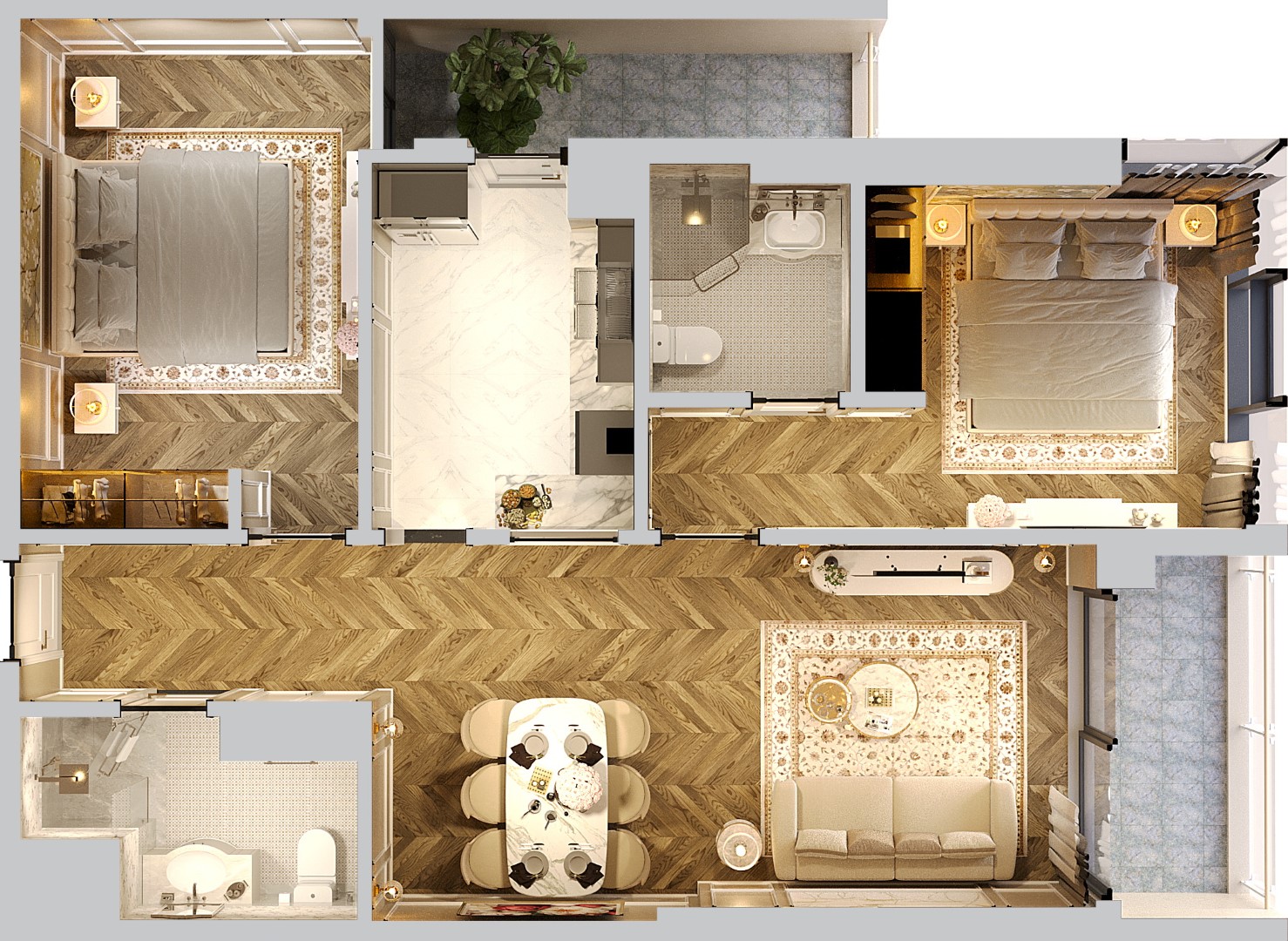 - 100% bếp tại căn 2PN, 3PN đều thông với logia thoáng