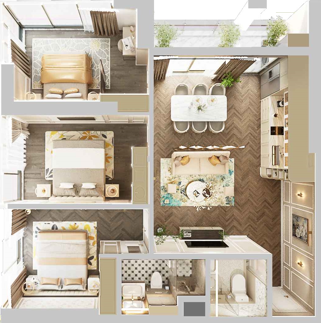 Mỗi căn hộ đều được thiết kế thông minh, tối ưu hóa không gian sử dụng và tận dụng ánh sáng tự nhiên, mang lại cảm giác thoải mái và thoáng đãng.
