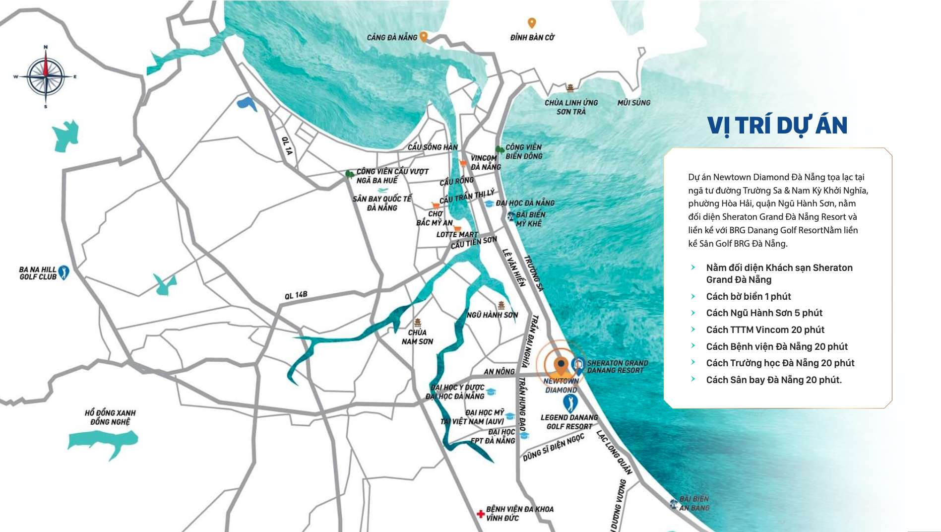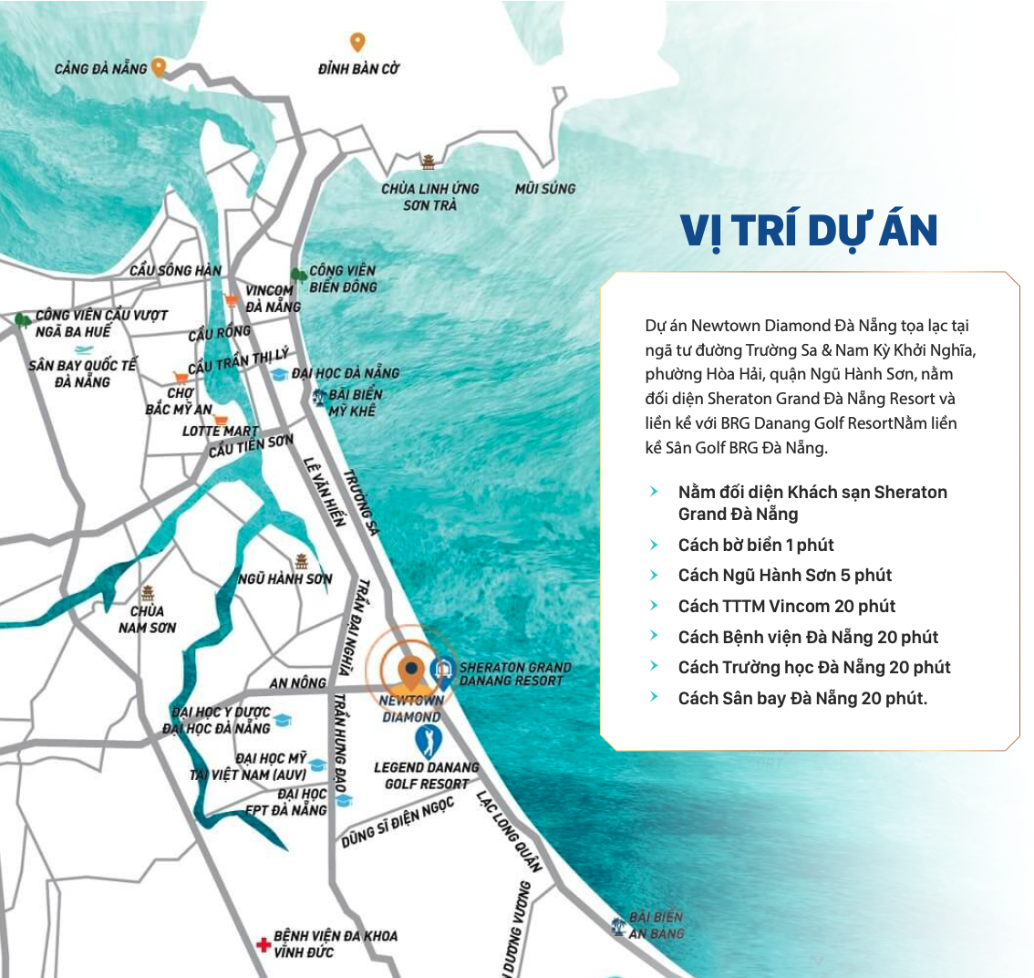 Dự án Newtown Diamond Đà Nẵng tọa lạc tại ngã tư đường Trường Sa & Nam Kỳ Khởi Nghĩa, phường Hòa Hải, quận Ngũ Hành Sơn, nằm đối diện Sheraton Grand Đà Nẵng Resort và liền kề với BRG Danang Golf ResortNằm liền kề Sân Golf BRG Đà Nẵng